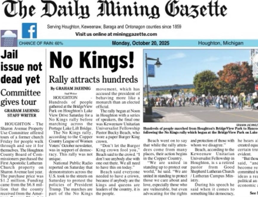 Copper Country united on Saturday to join the nation-wide NO KINGS protests. Thanks to the organizers and to everyone who turned out!