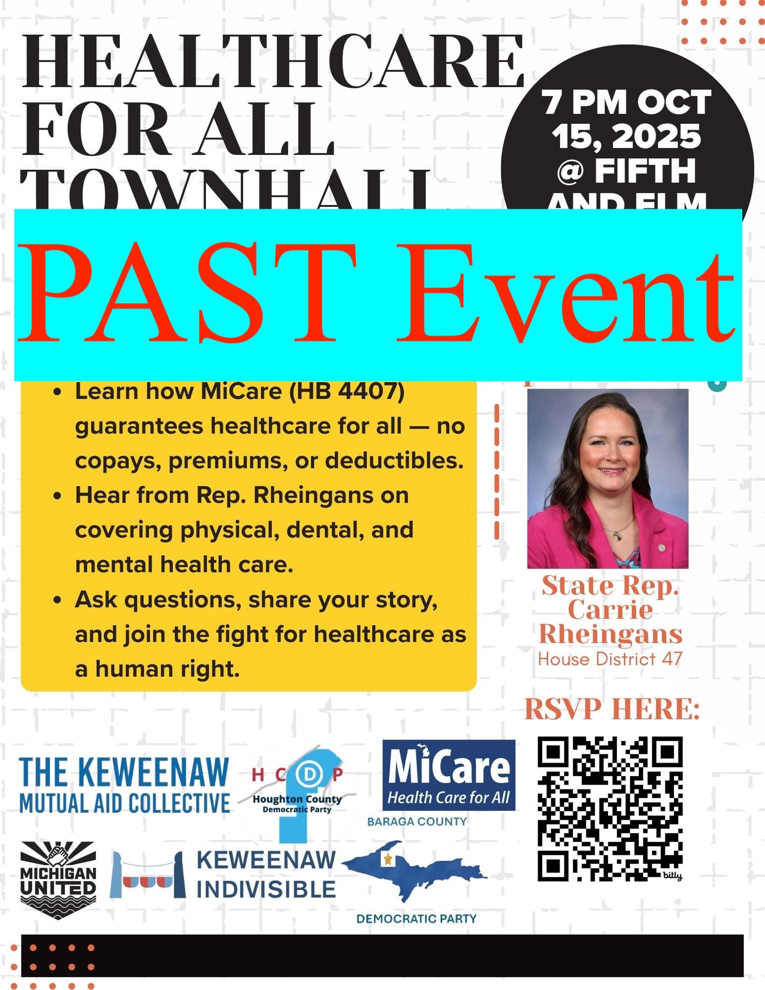 - Health Care for All Town Hall was held on Wednesday, October 15. Michigan House Representative Carrie Rheingans laid out her plan to to provide universal health care for all Michiganders in HB 4407, MiCare. The event was well attended, packing the Orpheum Theater. The proposal prompted lively discussion. Representative Rheingans emphasized that she is holding town halls across the state to get the word out, collect input from residents, and pressure the house to move the bill forward. The republicans are trying to kill it in committee.