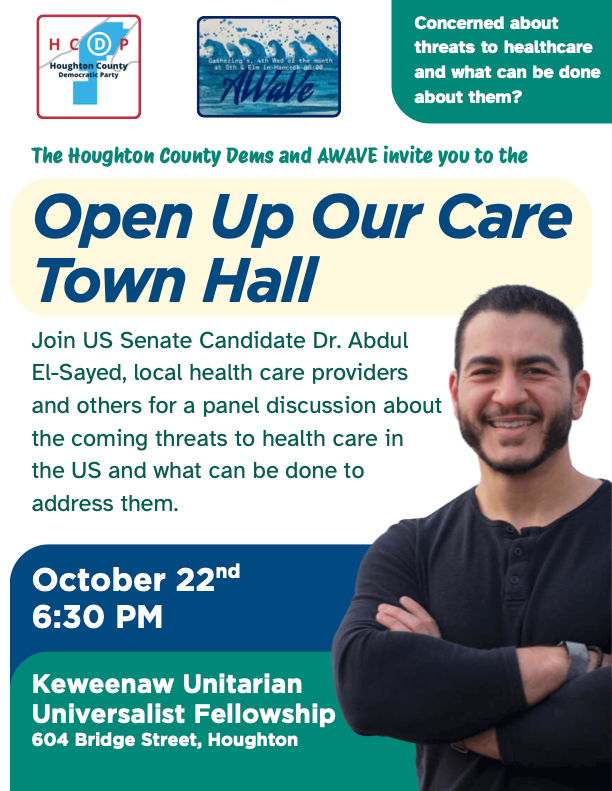 - Open Up our Care Town Hall, October 22, 6:30 pm, Keweenaw Unitarian Universalist Fellowship, with U.S. Senate Candidate Dr. Abdul El-Sayed.