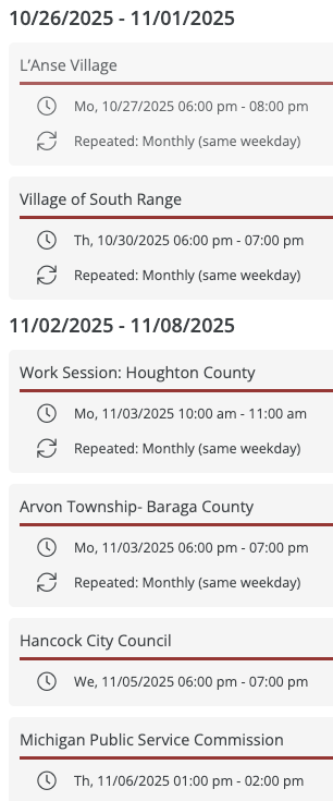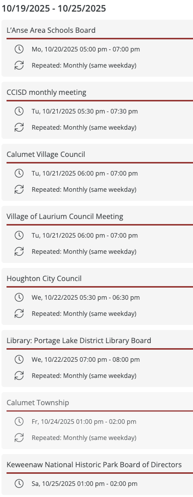 - Houghton County Commissioners, Tuesday, October 14, 6 pm.