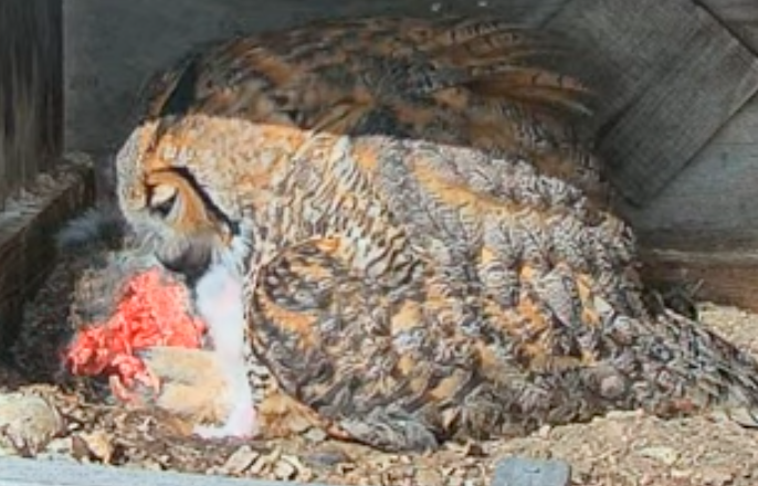 Rumored to be two hatchlings. The new camera lets you scroll back through the day to see action. I spotted lunch at 12:15 today, with the chick's fuzzy head just poking up under mom to get a bite. (Sorry, it's rather grizzly.)
