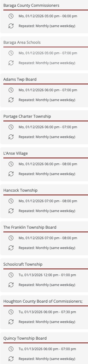 - Baraga County Democrats, 3rd Tuesdays at 6 pm, L'Anse Township Hall