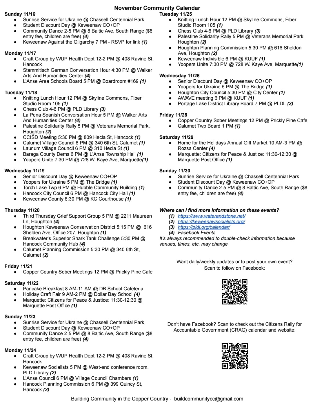 - Gov meetings: Schoolcraft Twp 12 PM, Quincy Twp Board 6 PM, Baraga Village 6 PM, Grant Twp 6 PM