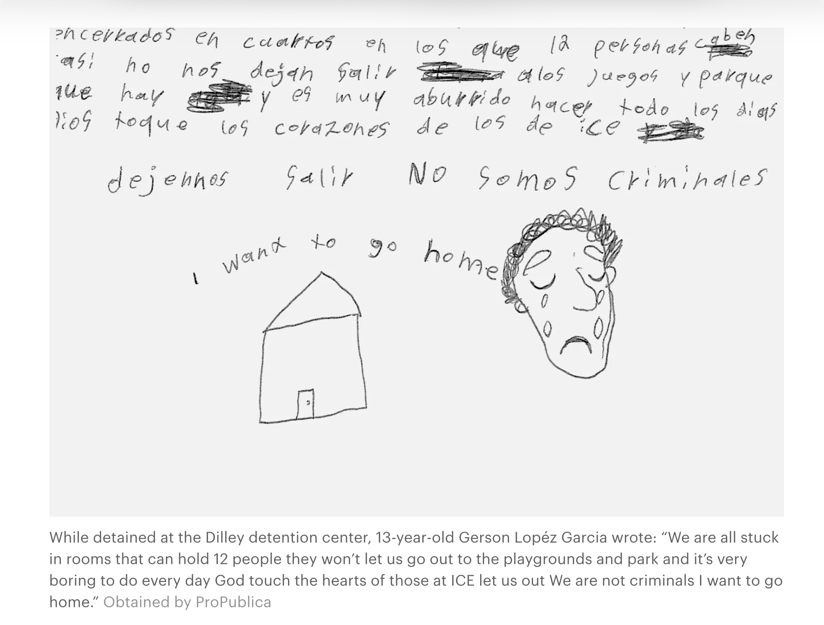 Multiply the image of little Liam Conejo Ramos in his bunny hat by 3,800; that's how many children were arrested and detained between January and October 2025. More than 1,700 children are being held in family detention facilities, mainly in Dilley Texas. Conditions are appalling, with bad food, bad water, poor medical care, no meaningful education, and 24-hour lights. Some kids have been there for months (NYT, gift link). ProPublica reports that guards have been confiscating letters and drawings by detained children to prevent theeir stories from getting out.