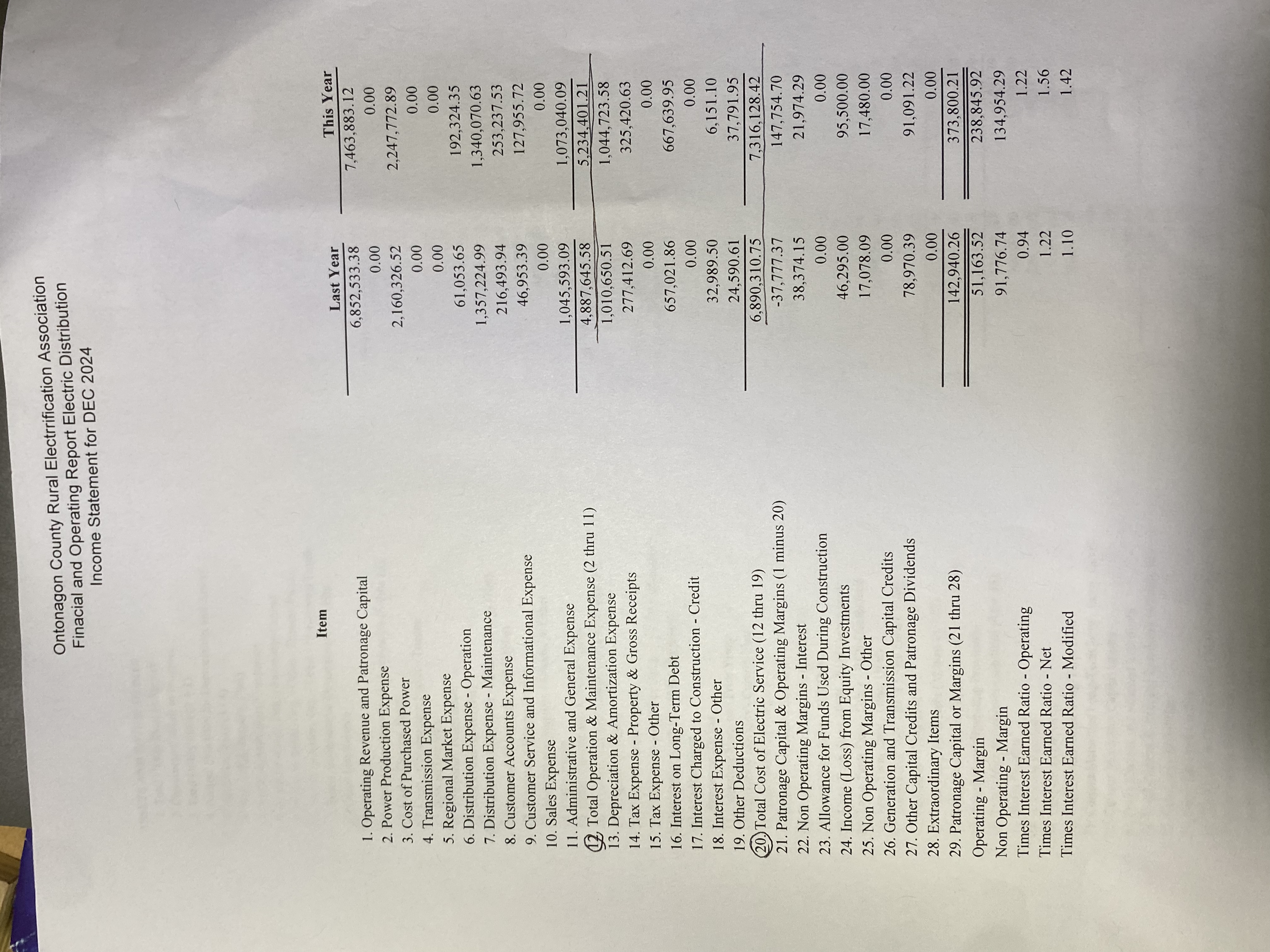 John Sobeck from NRUCFC confirmed that revenue from 2024 was short by $306,000. So a rate increase will be needed because for the coop the rate must equal the cost of power. OCREA has a very low number of services per mile relative to other coops. (Will his presentation be available on the web site?)
