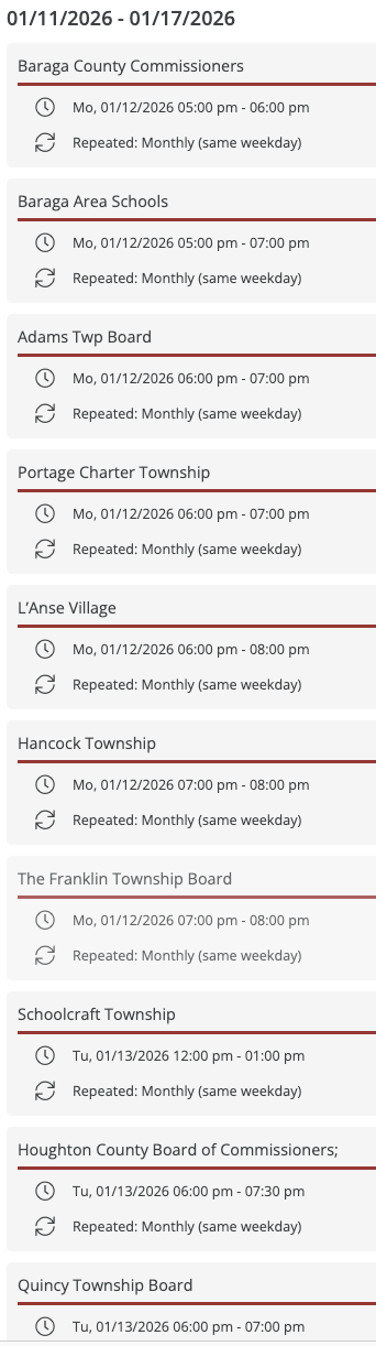 - Flock cameras voted down in Baraga County, vote indefinitely(?) postponed in Hancock